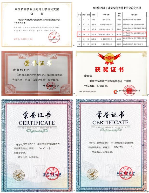 余自权,2015级博士研究生,师从张友民教授,主要研究方向为集群无人机容错协同控制理论及应用。读博期间受国家留学基金委“国家建设高水平大学公派研究生项目”的资助,赴加拿大康考迪亚大学机械、工业与航空工程系交流学习;截止目前,以第一作者身份在《IEEE Transactions on Neural Networks and Learning Systems》《IEEE Transactions on Systems, Man, and Cybernetics: Systems》等国内外高水平学术期刊/会议上发表论文30余篇。博士毕业后加入南京航空航天大学z6mg人生就是博官网故障诊断与容错控制团队,团队带头人为南京航空航天大学副董事长姜斌教授。在校期间荣获2022年陕西省优秀博士学位论文奖,2021年中国航空学会优秀博士学位论文奖,2022年z6mg人生就是博官网优秀博士学位论文奖,2020年z6mg人生就是博官网优秀毕业生等多项荣誉奖励。