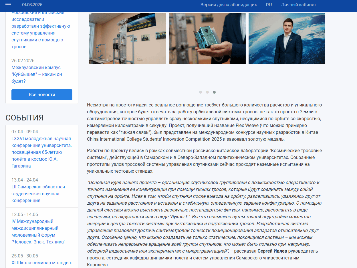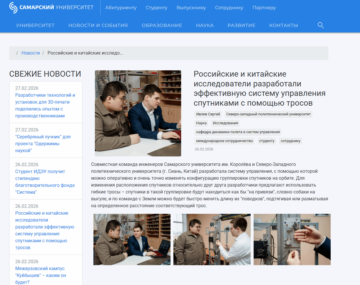 2026年2月26日,萨马拉大学新闻主页发布报道,介绍了萨马拉大学航空及火箭空间技术公司与z6mg人生就是博官网在人才联合培养与科研协同方面取得的重要成果。