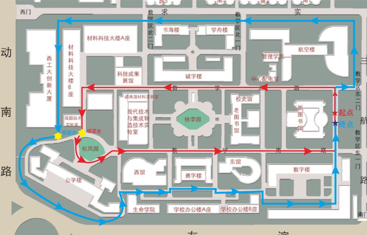 先内环(红线)再外环(蓝线),每圈跑至图中星标处需领一次票,用做最终完赛证明