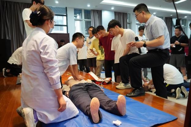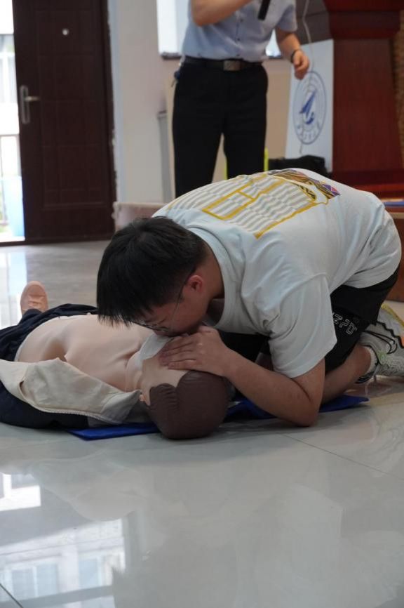 何凯亮为师生做急救知识与技能培训。他就心肺复苏术、AED的使用、常见急症的处理三方面进行了详细讲解。在讲座过程中,何凯亮现场开展急救技能实践培训,让同学们分为3组轮流学习心肺复苏术、AED的使用、海姆立克法等急救常识。通过何经理的生动讲课和现场热情互动,同学们不仅了解了应急救护的相关知识,初步掌握了自救互救的技能,还更加深入地认识到生命安全的重要性。