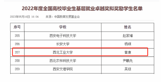 近日,中国教育发展基金会公布了2022年度全国高校毕业生基层就业卓越奖拟奖励员工名单,2019届电气工程及其自动化专业毕业生曾康入选。