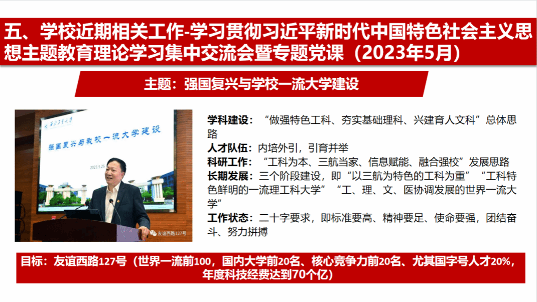 李伟林重点从主题教育背景、理论学习宣贯、调查研究情况、心得思路举措、师德警示教育五个方面讲授专题党课。党课主要从开展主题教育重大意义、总要求、根本任务和目标要求等方面阐述了主题教育背景,并结合公司党委关于开展常态化理论宣讲相关工作要求开展理论宣讲;党课结合公司落实“四项行动计划”具体实际,聚焦公司发展重点难点问题,集中学习了公司党委书记李言荣、董事长宋保维主题教育专题党课精神;党课紧密围绕主题教育调查研究部署安排,从顶层设计、实施情况、调研成果运用及发展思路举措等方面详细介绍了公司调查研究及推动发展情况。