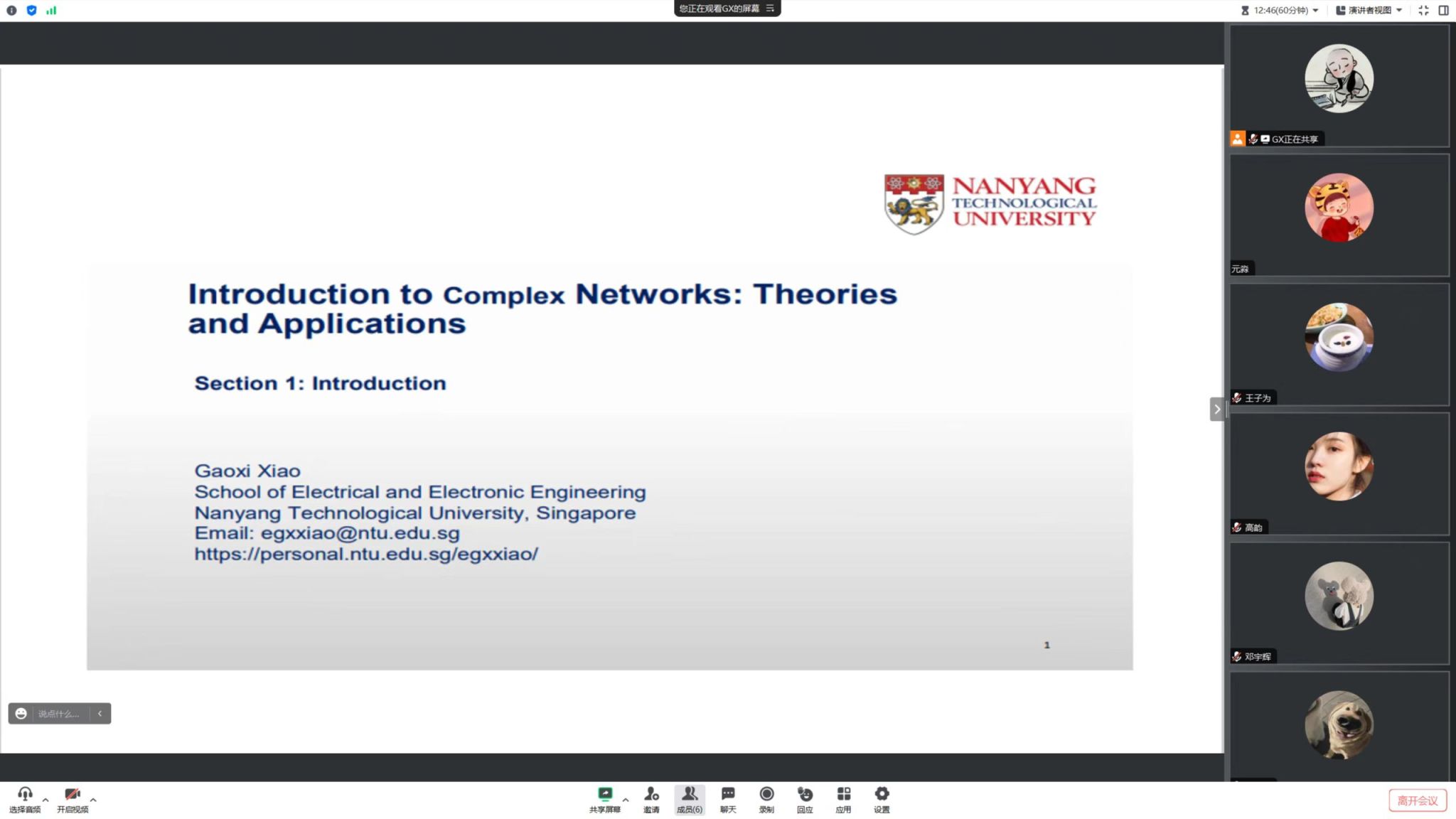 《复杂网络:理论及应用》由公司余孝军副教授邀请新加坡南洋理工的Xiao Gaoxi教授在线讲授。Xiao Gaoxi老师授课风格严谨又不失风趣,通过采用在线推导公式、动画演示等方式,积极回答员工疑问和讨论,激发了员工们的学习兴趣和激情。通过本课程的学习,开拓了员工们的视野,使员工们了解了如何使用复杂网络分析和解决现实问题,认识了复杂网络在现实生活中的重要作用,如疾病传播预测、经济发展预测等应用领域,并为后续开展相关领域的研究打下坚实的基础。