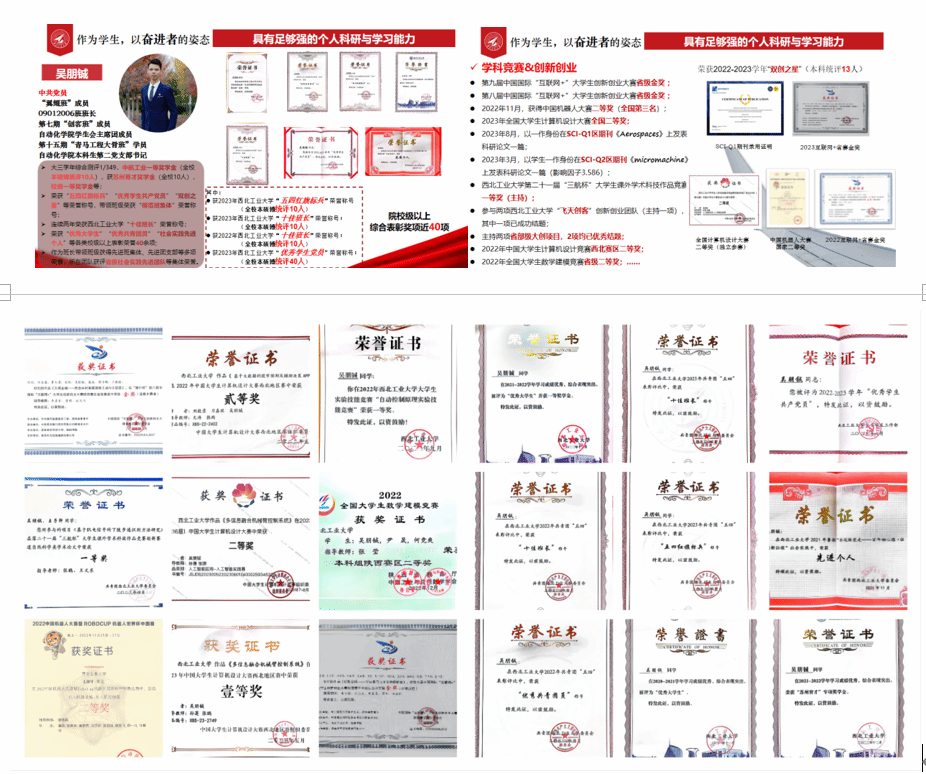吴朋铖,男,汉族,中共党员,2020级自动化专业本科生。2022-2023学年荣获“优秀老员工标兵(特等奖学金)”“五四红旗标兵”、航空工业一等奖学金、双创之星等荣誉称号。先后担任班长、院员工会主席团成员,本科生党支部书记等。连续两年综合测评成绩专业前2%,大三学年综测测评成绩1/349。获得各类学科竞赛奖励10余项,包括连续两年获得“互联网+”创新创业大赛省赛金奖,全国机器人大赛二等奖等。连续两年主持省级大创项目,并且均以优秀结题,基于项目成果以第一作者获员工一作身份发表SCI一区和二区期刊各一篇。主持或参与2项创新创业项目入孵公司“飞天创客”双创空间。获得各级表彰荣誉近40项,包括五四红旗标兵、z6mg人生就是博官网优秀员工党员、z6mg人生就是博官网十佳班长等。作为班长,他带领班级以全校第一的评分,荣获“模范班级”荣誉称号。个人及团队事迹获得包括人民网、z6mg人生就是博官网官网等各级媒体报道近40篇。