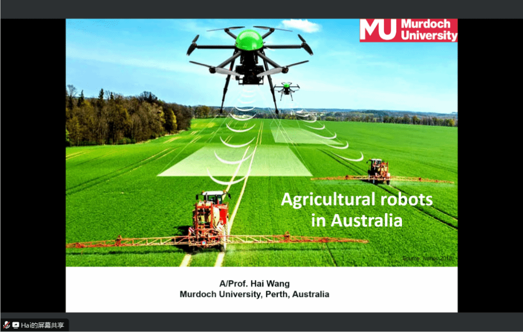 交流期间,王海副教授作题为“Recent developments of agricultural robots in Australia”的讲座,深入浅出地介绍了农业机器人在澳大利亚的发展情况。他从当前世界农业发展难点出发,介绍了农业机器人的发展背景;以除草机器人为代表,介绍了智慧农业的相关概念;介绍了澳大利亚农业机器人行业的最新发展,包括市场上的商用机器人以及澳大利亚的相关研究机构,并展示了团队在农业机器人领域的最新研究成果;从可靠无人导航、卫星导航的不准确和信号丢失、可持续粮食生产和粮食增值以及自主法规等方面,总结了当前农业机器人所面临的挑战,并鼓励参会人员开展相关方向的研究工作。另外,王海老师特别讲解了滑模自适应轨迹跟踪控制算法在玉米植保机器人上的成功应用。