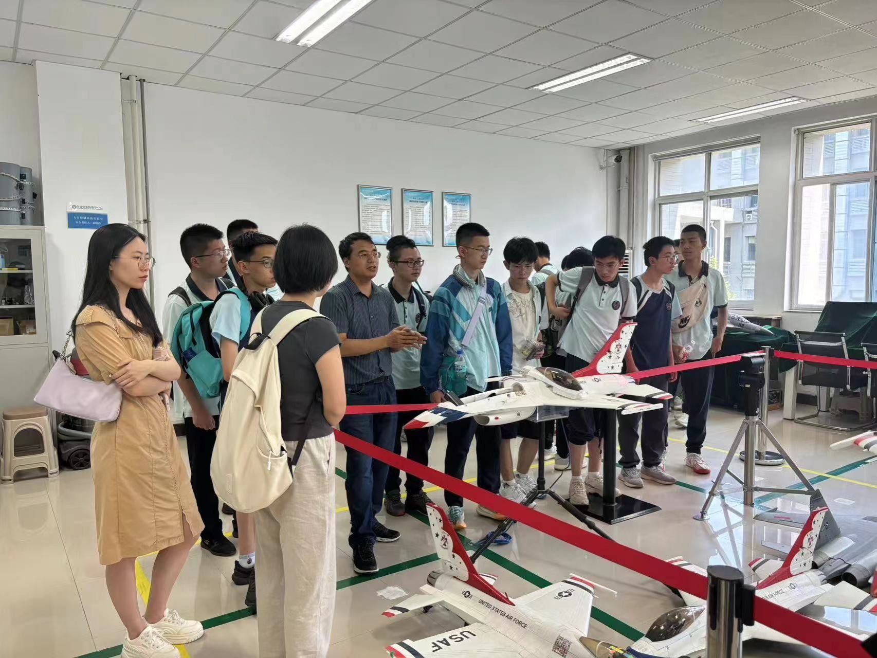 在飞行控制实验室,来访师生们被精致的缩比飞机模型深深吸引。通过介绍,他们了解了飞行控制技术的最新进展及其在航空航天领域的应用,感受到了科技对航空事业的巨大推动作用。