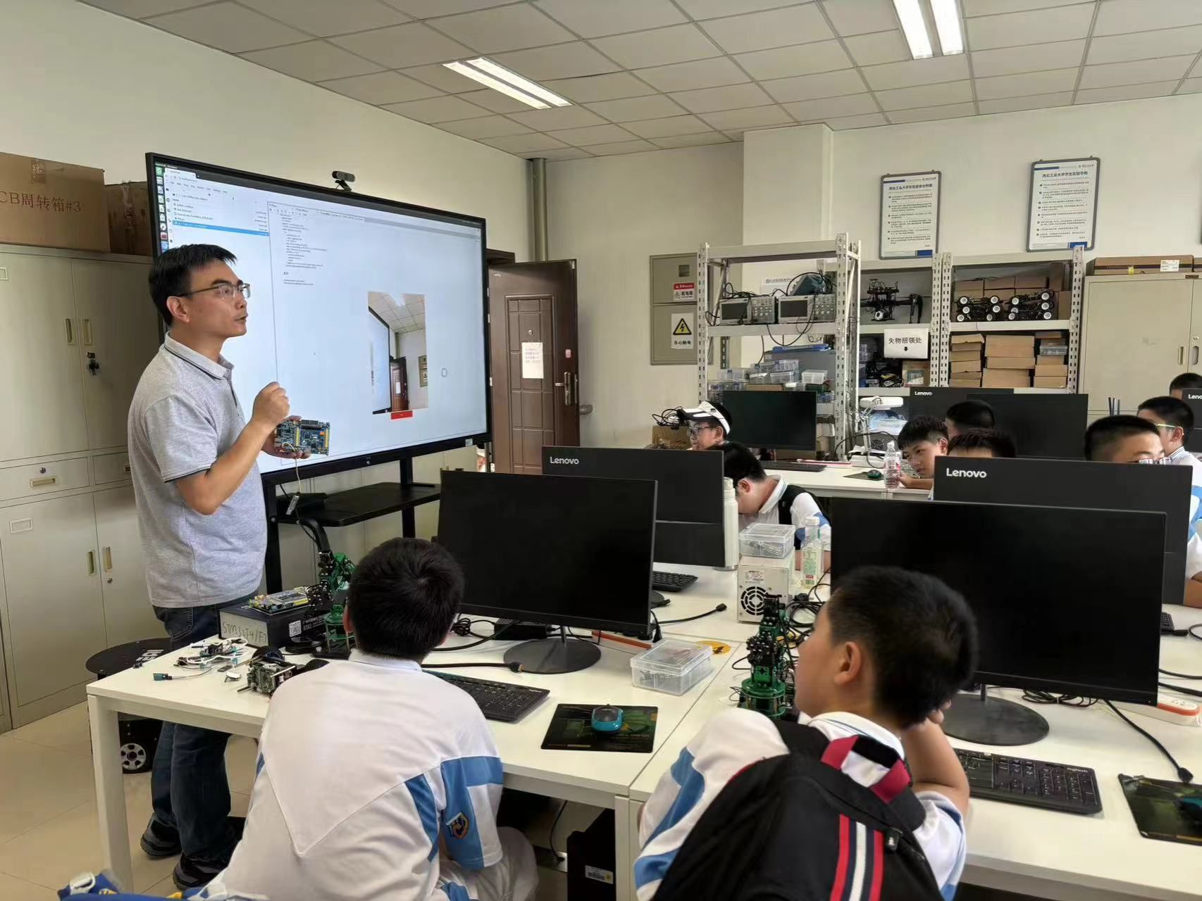 在嵌入式实验室中,来访师生亲手体验了嵌入式小车的操作与控制。这种实践性的学习方式让他们对嵌入式技术有了更直观的认识和更深入的理解,启发他们感受嵌入式技术在智能设备中的广泛应用和重要性。