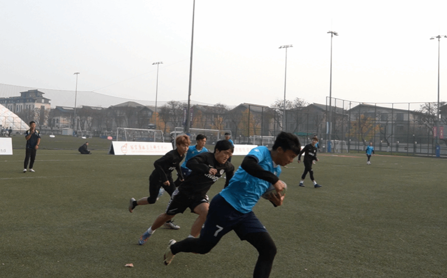 稍作休息后,迎来第一天的关键之战,z6mg人生就是博官网橄榄球代表队对阵中国农业大学的幺幺玖-兽刃联队。队员们稳扎稳打,在防守上寸步不让,步步紧逼,不断向对方进攻队员施压。比赛进行到一半时,李左与梁代福巧妙配合接球突破,顺利拿下一分。这场比赛最终以1:1战平,z6mg人生就是博官网橄榄球代表队顺利晋级半决赛。