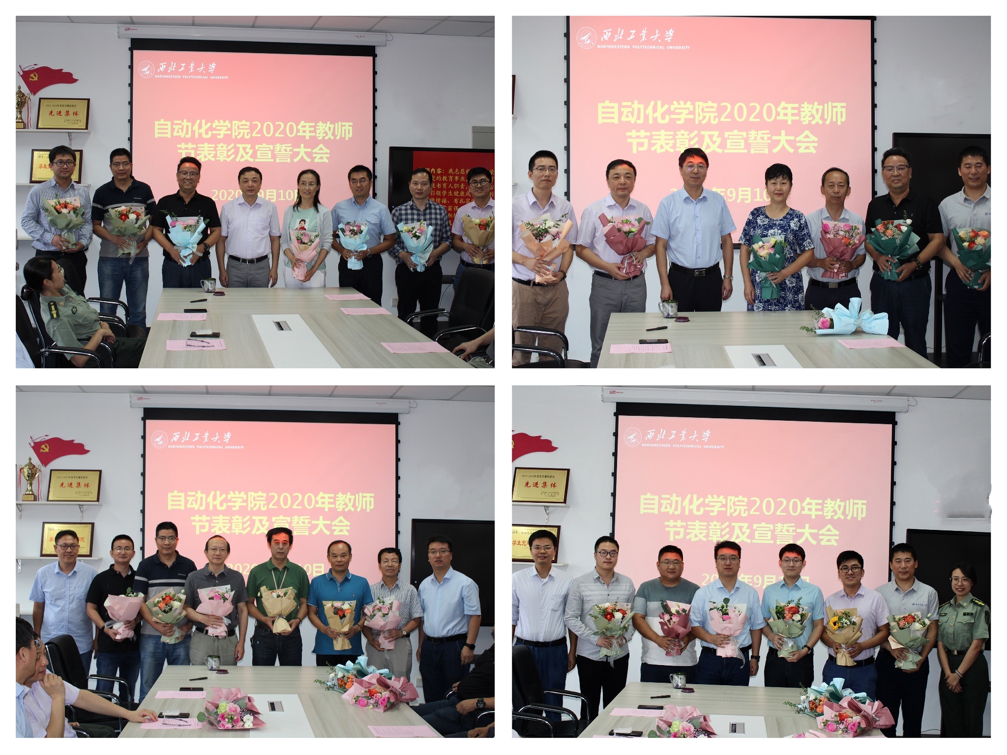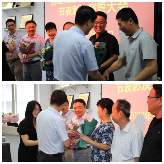 接下来,由公司领导班子成员潘泉、黄攀峰、马玥、许斌、刘准钆、王小旭分别为获奖教师颁奖并与大家合影留念。此次表彰大会有25名教师获奖,其中包括“2020年度“十育人”先进个人、2019-2020学年最满意教师、2019-2020年度研究生教育优秀导师、优秀青年教师(吴亚军奖)特等奖、2019-2020年度优秀班主任、优秀辅导员,员工竞赛优秀组织教师等18个奖项。