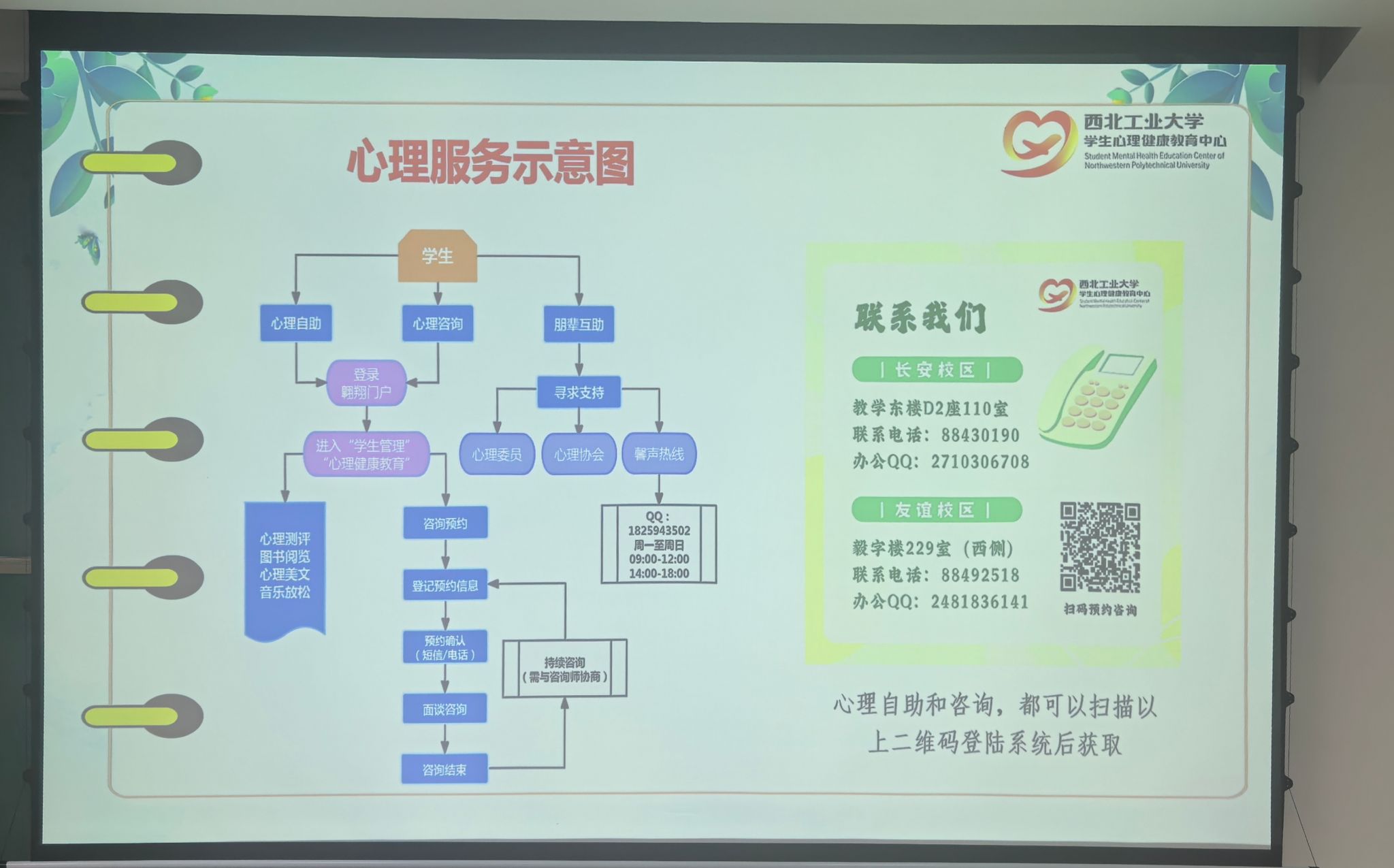 最后,郭老师讲解了老员工心理适应不良的具体表现以及可能影响老员工心理适应的来源,并提出了老员工心理适应的调适策略,分享了公司丰富多彩的心理健康服务。她指出,心理健康教育中心始终致力于为每一位西工大学子提供服务,除了常规的心理咨询,还有形式多样的朋辈互助、心理游园会、手语操大赛等活动,为同学们排忧解难。讲座最后,郭老师祝愿在场的 2025 级新生们都能拥有美好的心灵,具备爱与成就的能力!