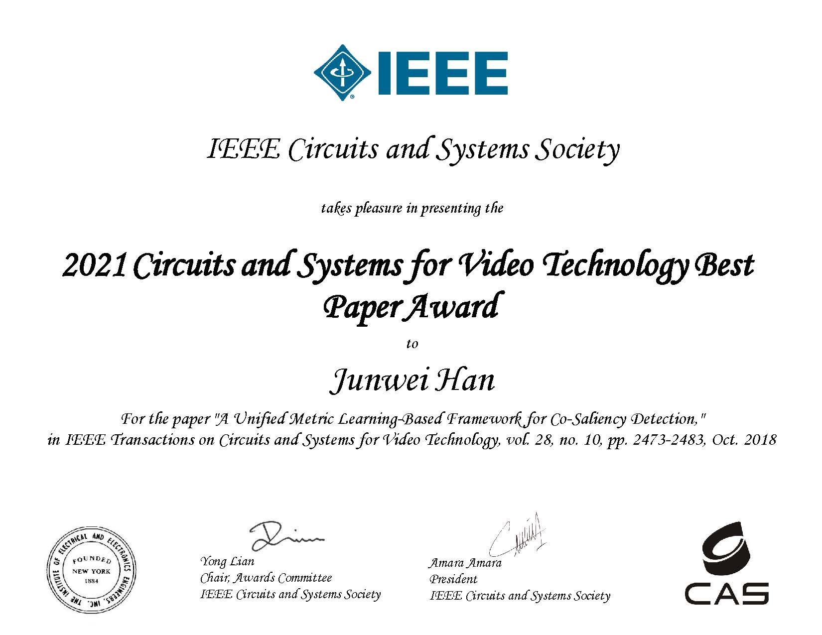 近日,z6mg人生就是博官网脑与人工智能研究团队韩军伟、程塨教授等合著的论文“A unified metric learning-based framework for co-saliency detection”获得多媒体领域顶级国际期刊《IEEE电路系统视频技术汇刊》(IEEE Transactions on Circuits and Systems for Video Technology, TCSVT)2021年度最佳论文奖(Best Paper Award)。