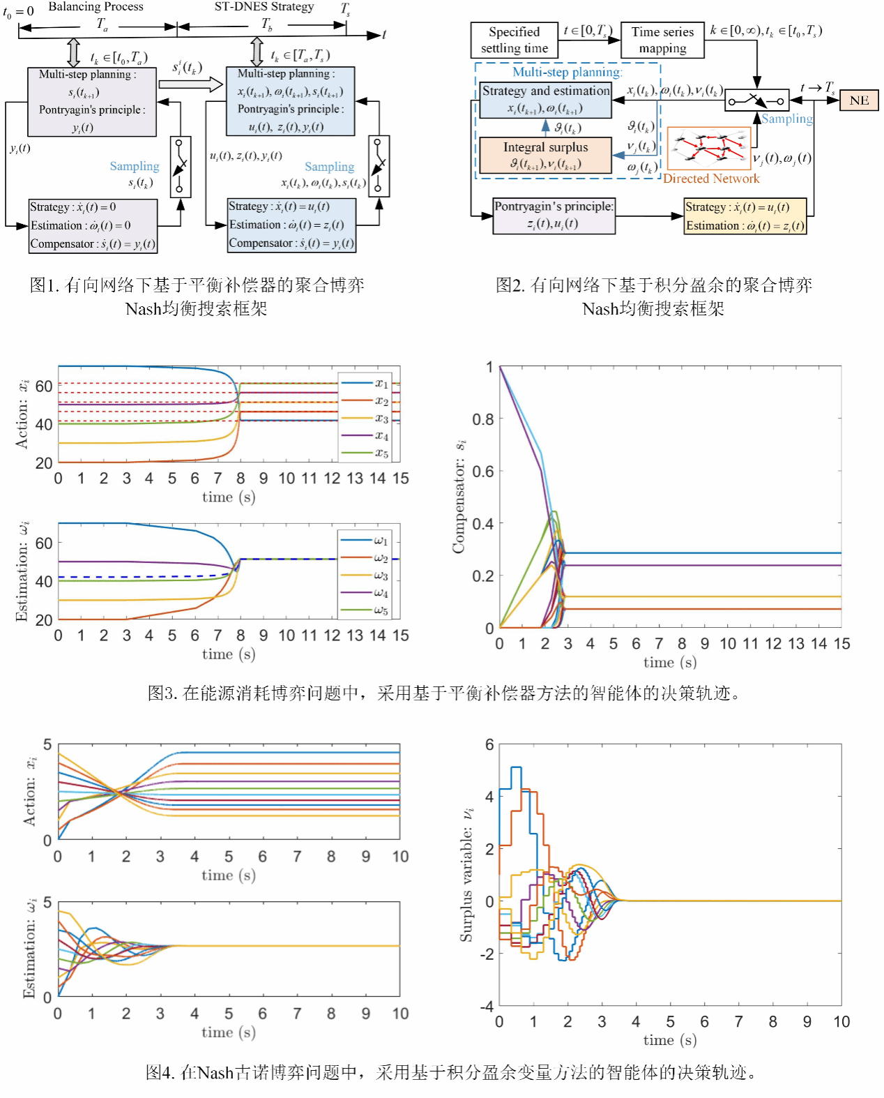 针对现有聚合博弈算法依赖无向网络、收敛时间无法预先设定、在大规模网络中通信计算冗余等挑战,团队创新性地提出了 “指定时间规划与搜索” 研究框架(如图1、图2所示)。该框架将分布式平均估计器与纳什均衡搜索策略深度融合,通过设计采样时间序列和基于庞特里亚金极大值原理的最优控制器,首次实现了在用户预指定时间内,使所有博弈智能体(参与者)的策略精确收敛至纳什均衡。相关成果以长文形式发表于控制领域权威期刊《IEEE Transactions on Automatic Control》(IEEE TAC),题为《有向通信网络上的指定时间分布式纳什均衡搜索》(Specified-Time Distributed Nash Equilibrium Seeking in Aggregative Games Over Directed Communication Networks)。该论文由z6mg人生就是博官网博士研究生陶倩乐与z6mg人生就是博官网刘永芳和赵宇教授等共同完成。