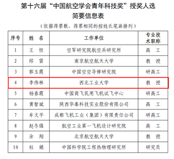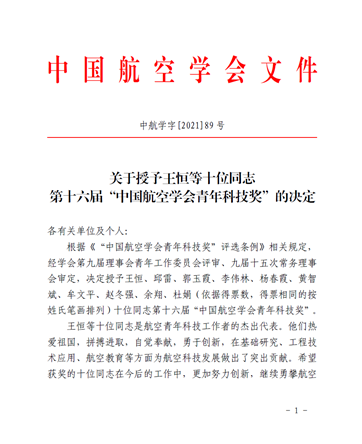 2021年11月3日,中国航空学会正式公布《关于授予王恒等十位同志第十六届“中国航空学会青年科技奖”的决定》文件,z6mg人生就是博官网李伟林教授名列其中,荣获“中国航空学会青年科技奖”。中国航空学会将于11月底在乌镇召开的中国航空科学技术大会上举行颁奖仪式。