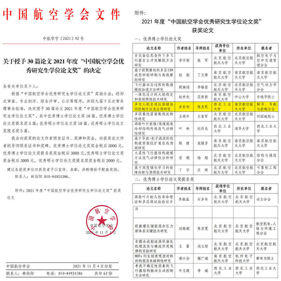 据了解,中国航空学会优秀学位论文奖旨在推动中国航空科技进步,鼓励创新性研究,促进青年人才成长。2021年度共评选出10篇优秀博士学位论文奖、5篇优秀博士学位论文提名奖。获得优秀博士学位论文奖的余自权曾获z6mg人生就是博官网优秀博士毕业生、工信部创新奖学金二等奖等学术奖励。基于其博士论文研究工作、目前以第一作者身份在IEEE Transactions on Neural Networks and Learning Systems、IEEE Transactions on Control Systems Technology等期刊、会议发表学术论文30余篇,其中SCI论文近20篇,EI论文10余篇。主持国家自然科学基金青年基金1项、江苏省自然科学基金青年基金1项、中国博士后特别资助项目1项(站前)、中国博士后面上项目1项、中央高校基本科研业务费2项。