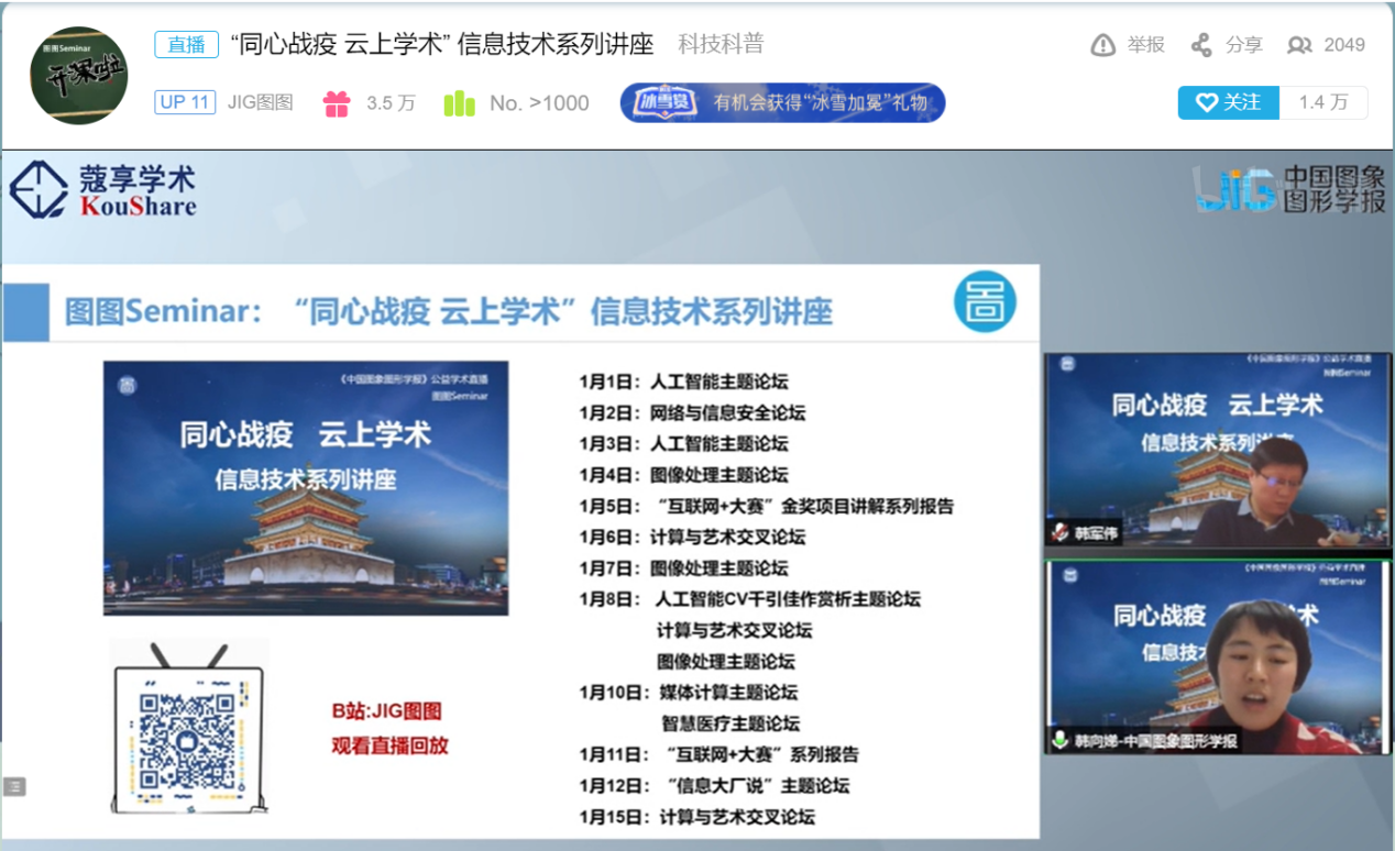 此次系列公益学术讲座活动由《中国图象图形学报》所有西安籍编委发起,z6mg人生就是博官网参与牵头、率先倡议,中国科公司空天信息创新研究院、陕西省计算机学会、西安交通大学、西安电子科技大学、上海科技大学、中科院计算技术研究所、华中科技大学、中科院信息工程研究所等多所国内著名高校和学术研究团体共同策划、组织。从1月1日起,活动相继推出了人工智能、图像处理、网络与信息安全、计算与艺术、媒体计算、智慧医疗、信息大厂说、互联网+大赛金奖项目解读等8个主题共16场讲座。中国科公司空天信息创新研究院经理吴一戎院士,西安交通大学电子与信息学部主任管晓宏院士,西安电子科技大学人工智能公司焦李成院士,z6mg人生就是博官网董事长助理、国家级高层次人才张艳宁教授等43位著名专家学者受邀做了主旨报告。活动一方面得到了学界前辈和同仁的鼎力支持,另一方面也受到了疫情封控中的西安高校师生的热烈反应。据平台在线人数统计,从2022年1月1日开幕至1月14日闭幕,线上观看师生人数总计超过53万人次,实现了战疫、育人“两不误”和“双胜利”。