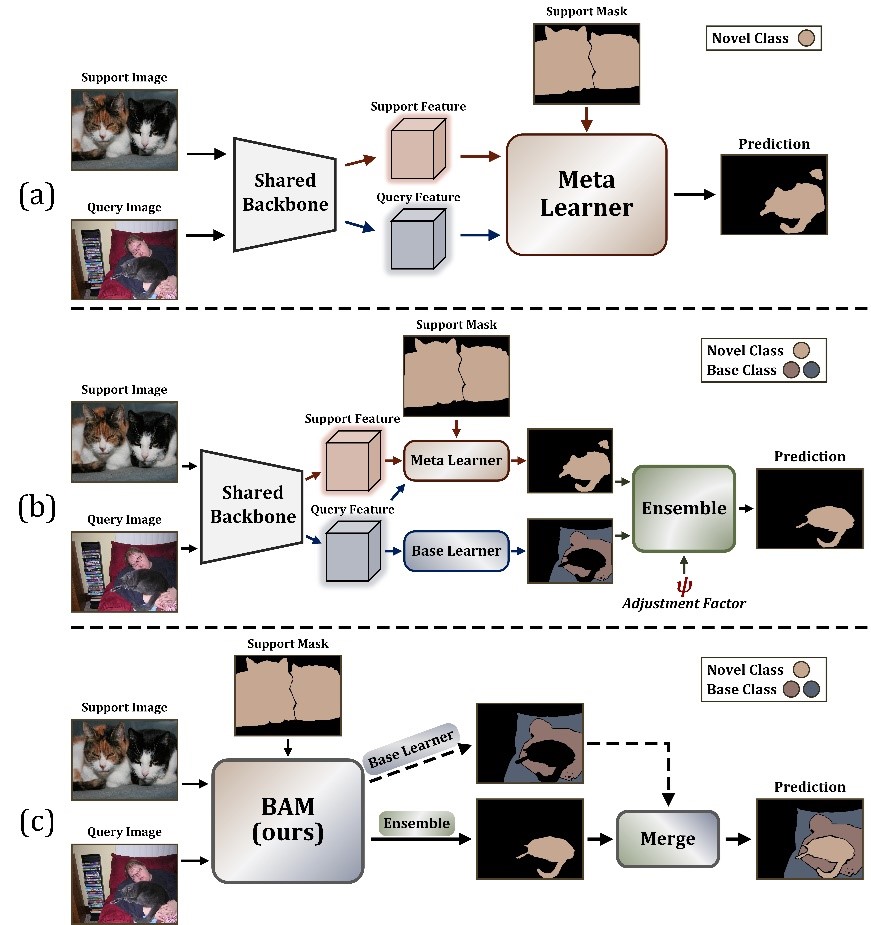 当前小样本语义分割的研究大多通过元学习框架来实现泛化;然而,在这样的范式下训练的模型往往存在基类偏执,而非理想化的类别无关。为此,本文提出在小样本分割模型(元学习器)上引入一个分支(基学习器)来明确地识别基类的目标,即不需要分割的区域。然后,对两个学习器并行输出的粗结果进行自适应集成以得到精确的预测。更令人惊讶的是,我们的方案利用两个朴素的学习者获得了最优异的性能指标,并能够扩展至更具挑战性的广义设置。