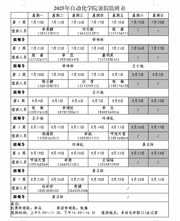 二、各系、实验室、教学中心、公司办公室要切实做好暑假期间安全、保密、保卫工作,主要负责同志手机要保持24小时畅通。放假前各单位要组织安全检查,排除隐患。放假离校要关闭电源、锁好门窗、确保安全。