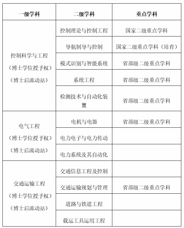 公司拥有控制科学与工程、电气工程、交通运输工程3个一级学科,其中控制科学与工程学科在全国第五轮一级学科评估中成绩优异,取得历史性突破;拥有电子信息(控制工程、仪器仪表工程、人工智能)、能源动力(电气工程)、交通运输(道路交通运输、航空交通运输)、机械(机器人工程)等专业学位领域;设有3个博士后流动站。