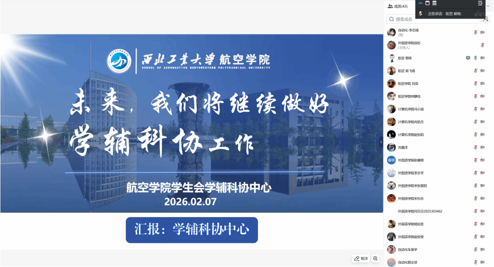 航空公司员工会学辅科协中心负责人郭栋介绍了学辅科协中心的工作,重点围绕学业辅导和科创竞赛,特别是微积分专项帮扶和跨院合作,体现了学业支持的精准性和协同性。他介绍了航空公司在联合帮扶与“飞豹杯”赛事中取得的成果,并指出未来将进一步优化帮扶形式与赛训服务,持续完善现有工作模式。