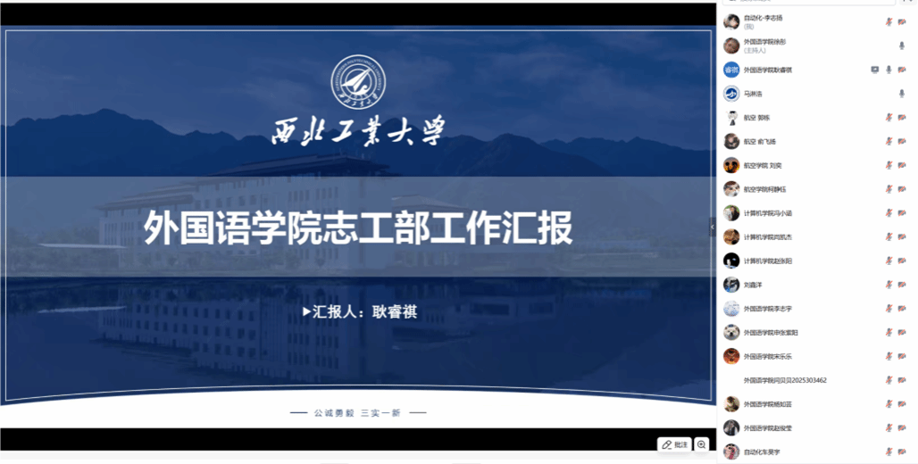 外国语公司志工部负责人耿睿祺介绍了外国语公司的两大核心志愿项目:四六级帮扶活动和国际文化交流志愿者服务队。他说,这两项活动体现了外语专业与志愿服务的有力结合,并在语言应用能力、组织协调能力与国际视野三个层面提升了员工的专业实践能力。未来,部门将进一步创新文化传播形式、深化品牌项目,持续推进专业优势与志愿活动的融合。此外,他还总结了部门在职业志愿实践平台方面取得的进展,并展望了系统化、国际化的发展方向。
