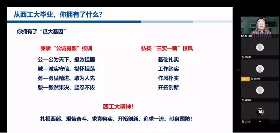 3月18日下午,z6mg人生就是博官网线上举办了2020届硕士毕业生“最后一课”暨2020级春季博士入学教育课,公司党委书记潘泉教授以“秉承西工大精神,争当新时代先锋”为题进行讲授。参加此次教育活动的有公司党委副书记马玥,辅导员汪远林、扈晓翔及269名硕博士。
