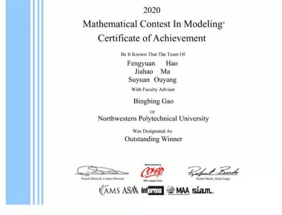 近日,2020年美国国际老员工数学建模竞赛(MCM)与交叉学科建模竞赛(ICM)成绩揭晓,公司2017级本科生欧阳苏媛所在团队荣获Outstanding Winner奖项(下称O奖),即国际特等奖,指导老师为公司青年教师高兵兵。O奖今年在中国的获奖率仅有0.2%,该团队完成的B题全球只有五支队伍获此殊荣。同时,作为公司今年唯一一支获得O奖的队伍,实现了近三年来公司在该赛事中一次新的突破。