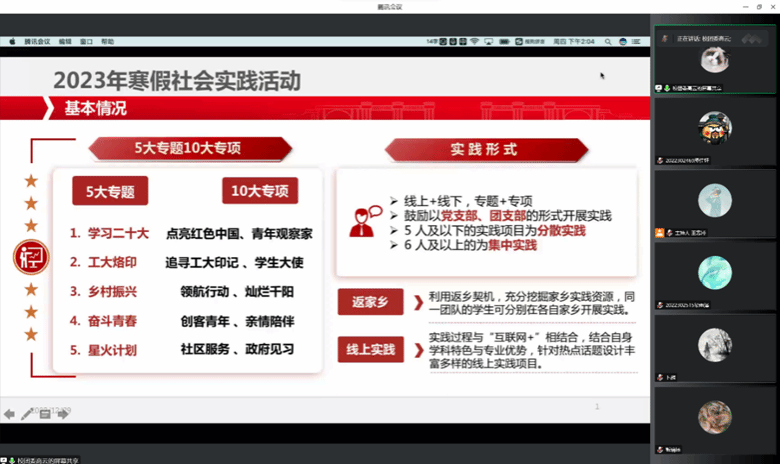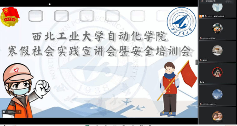 会上,高云详细介绍了本次寒假社会实践选题和实践形式,建议大家利用返乡契机,充分挖掘家乡实践资源,鼓励广大学子在实践中提高认识、拓宽视野、了解国情;曹正阳作为优秀实践代表分享了包括实践选题、开展、宣传及报告撰写等多方面的经验;周杨就实践过程中的饮食安全、交通安全、人身安全、财物安全等进行讲解,要求同学们提高自我防范意识,保障人身安全。